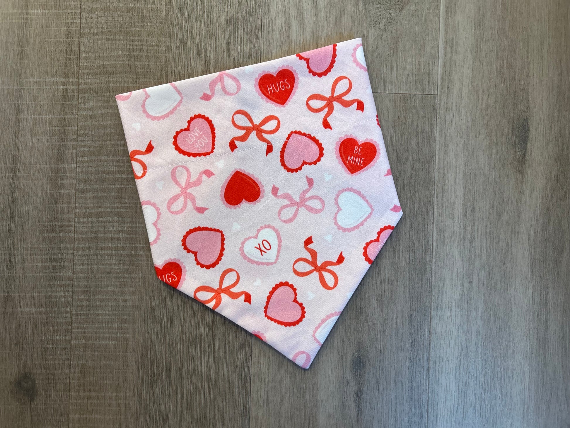 Bows and Conversation Heart Valentine’s Day pattern over the collar dog bandana. Available in sizes XS, S, M, L/XL.